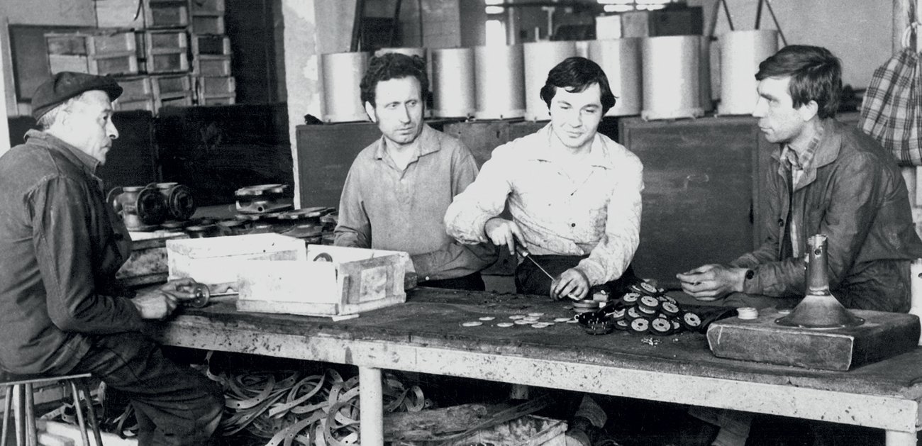 Бригада слесарей под руководством бригадира И.Э. Юрчика (на снимке второй слева) на сборке РДУК