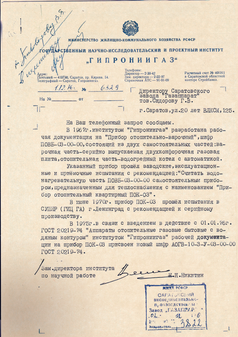 В этом году на предприятие поступил приказ Министерства жилищно-коммунального хозяйства РСФСР: провести испытания головного образца АОГВ — аппарата отопительного газового бытового, и в случае удовлетворительных результатов испытаний изготовить опытную партию изделий.